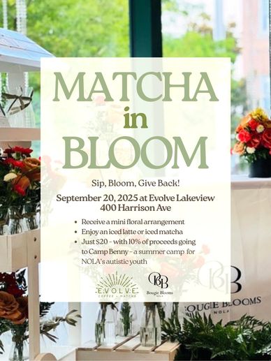 For just $20, you get a mini floral arrangement and your choice of either a iced latte or iced matcha. Plus 10% of proceeds benefit Camp Benny, supporting summer camp experience for New Orleans autistic kids and families.